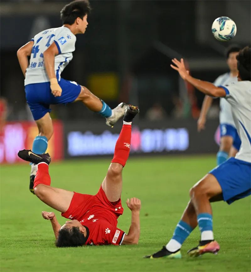 7月20日晚,“苏超”第七轮苏州队VS镇江队比赛中,苏州队球员寇程“倒挂金钩”。蒋文超 摄