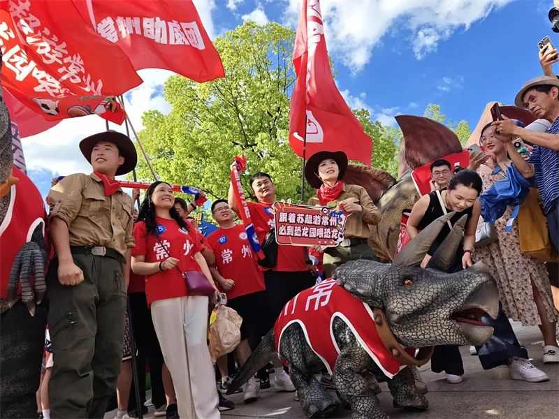 7月20日,常州奥体中心门口,上次被”气晕”的恐龙角角,成了大家追捧的明星,市民和球迷争相与它合影留念。邵华美 摄