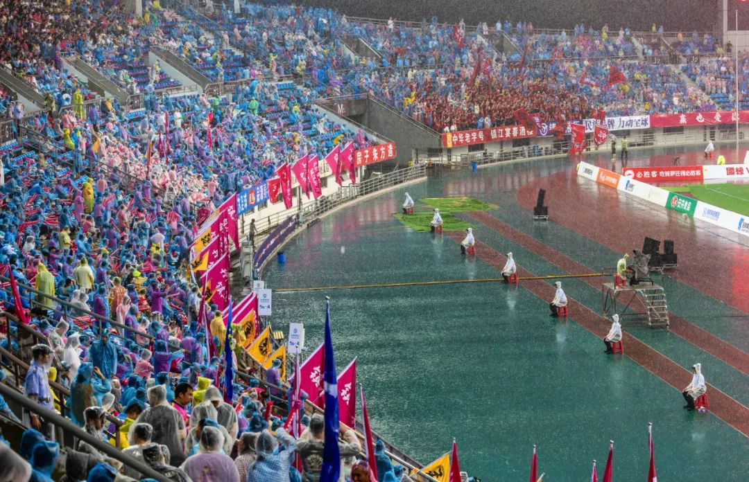 8月2日晚,镇江体育会展中心,“苏超”镇江主场对阵南通队比赛中,大雨滂沱,现场球迷热情丝毫不减,镇江公安民警冒着大雨,坚守岗位,执行安保任务。陈云凤 摄