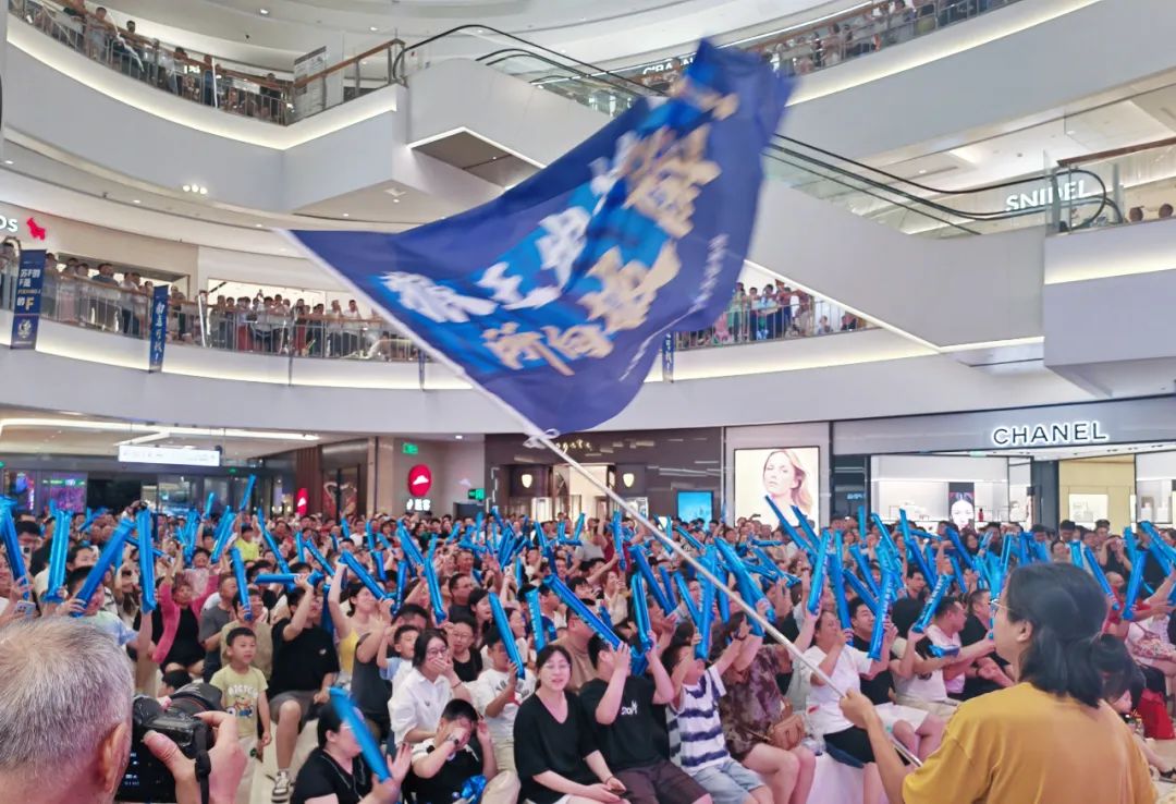 8月2日晚,“苏超”第八轮首个比赛日,南通队在客场挑战镇江队,当南通队第一粒进球时,南通市崇川区万象城的观众沸腾了!李斌 摄