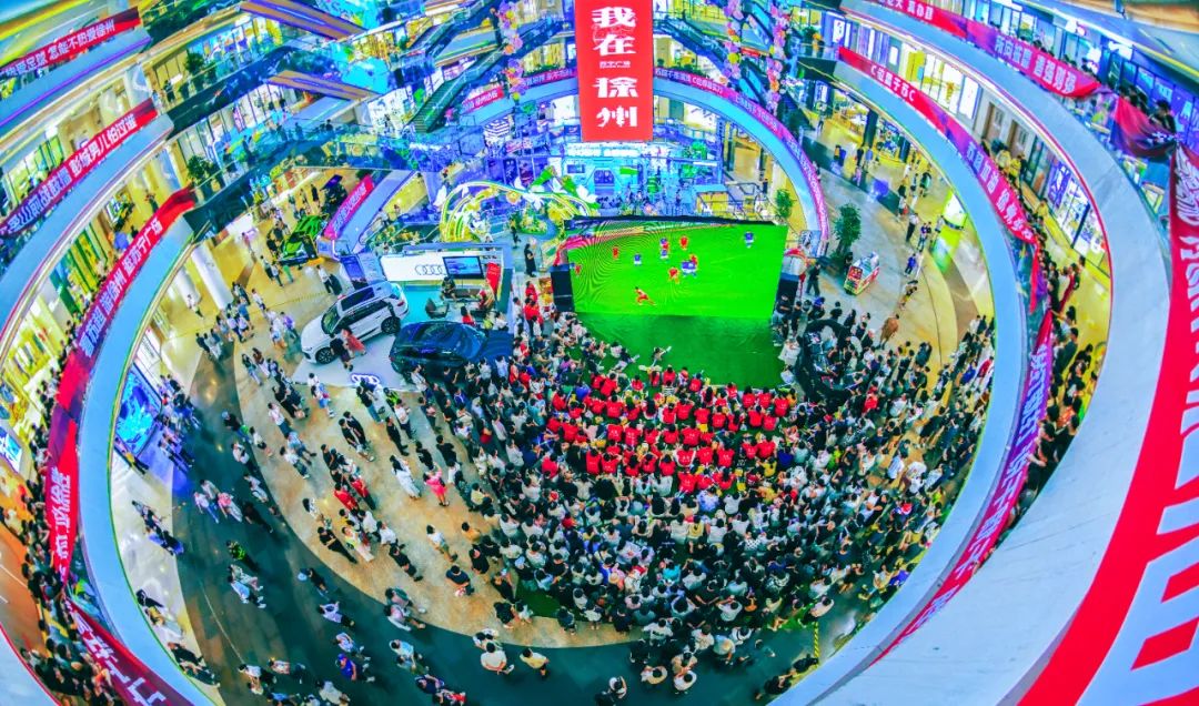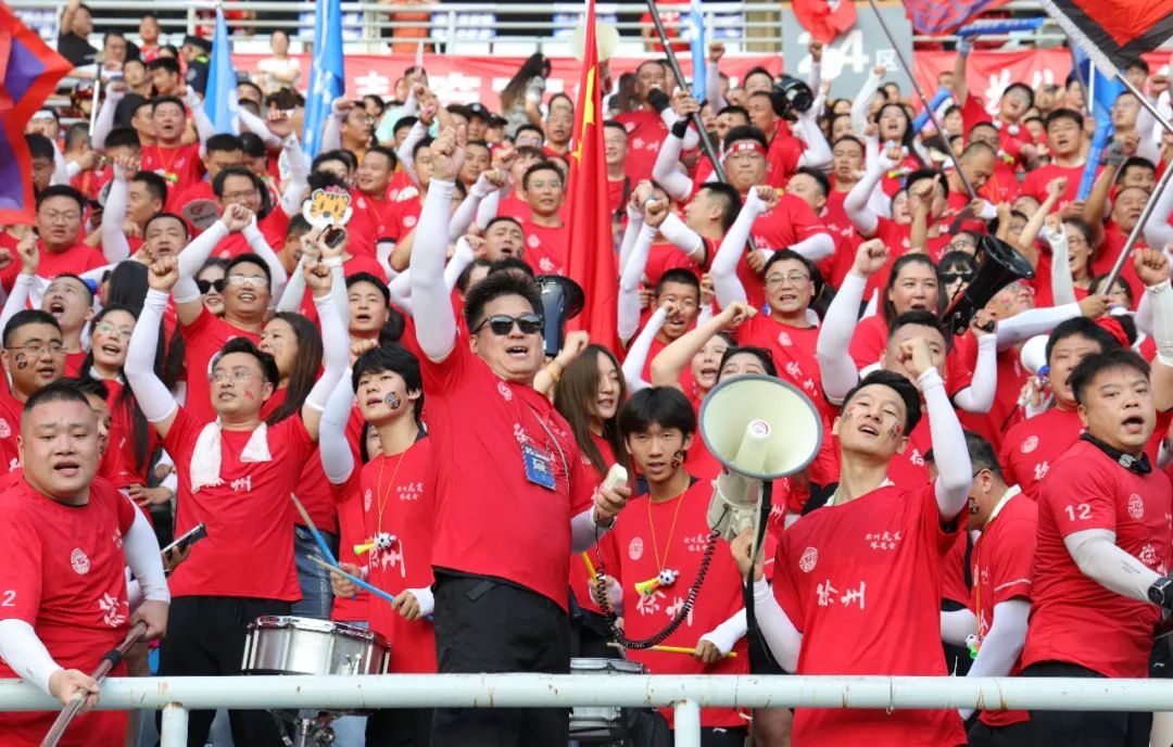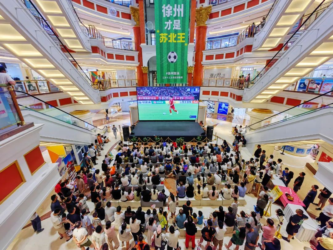 在徐州经开区金龙湖、环球港商场的“苏超”第二现场,球迷们为家乡队加油助威。高刚 摄