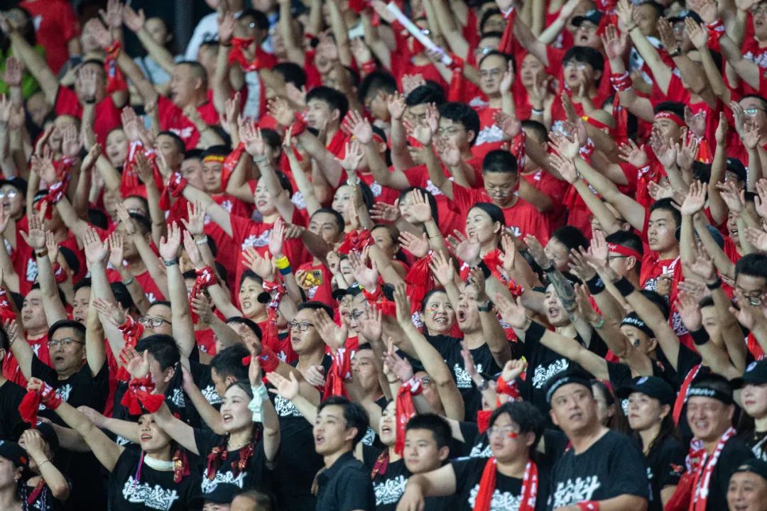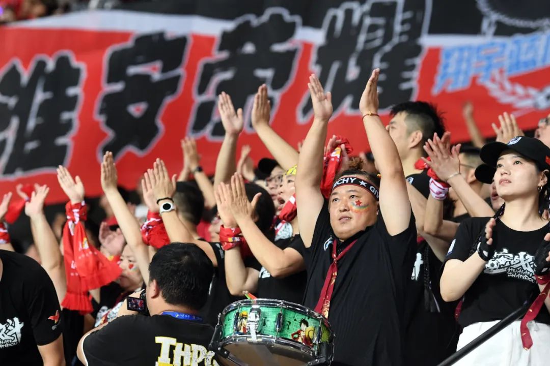 在徐州苏宁广场直播大屏前,球迷欢呼呐喊为自己的球队加油。刘立明 摄