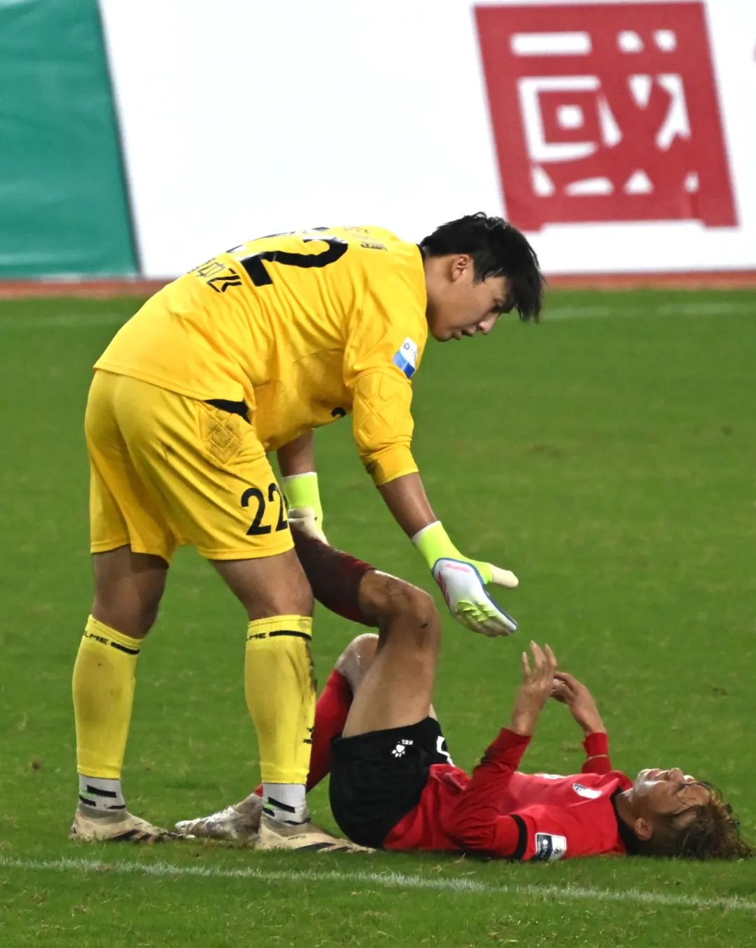 8月2日,“苏超”第八轮,淮安队VS苏州队比赛在淮安市体育中心激情上演。21:09分,苏州队守门员帮助淮安队队员缓解伤痛,彰显赛场上的体育精神。余萍 摄