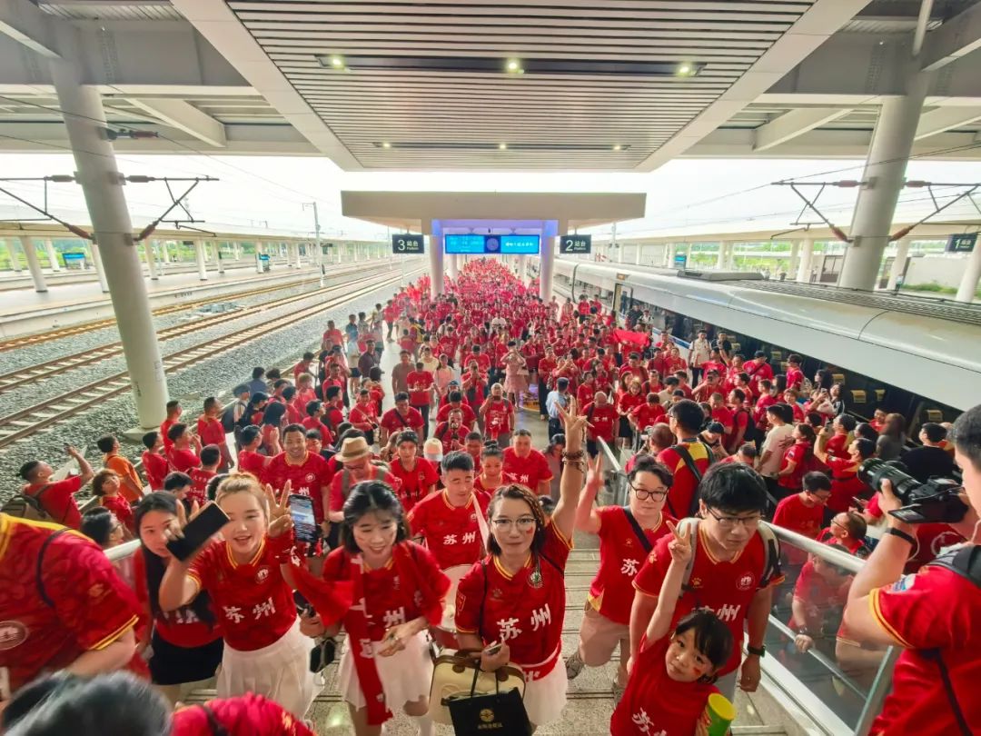 8月2日,苏州球迷乘坐 D9556次列车抵达淮安东站。王昊 摄
