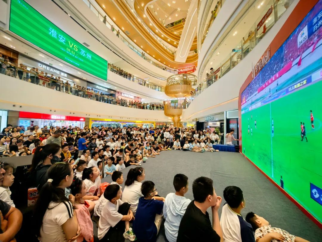 8月2日比赛当晚,淮安市民在华信MALL等商场和广场直播观赛点,观看淮安队与苏州队的“苏超”比赛直播,为球队加油助威。桂宝林 摄