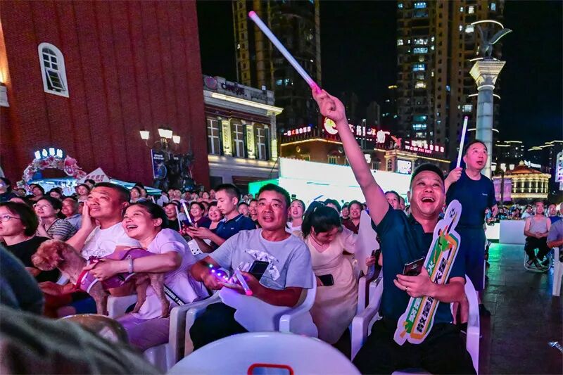 盐城的欧风花街广场的第二现场,球迷们在广场上围坐在大屏幕前观看比赛。孙江 摄