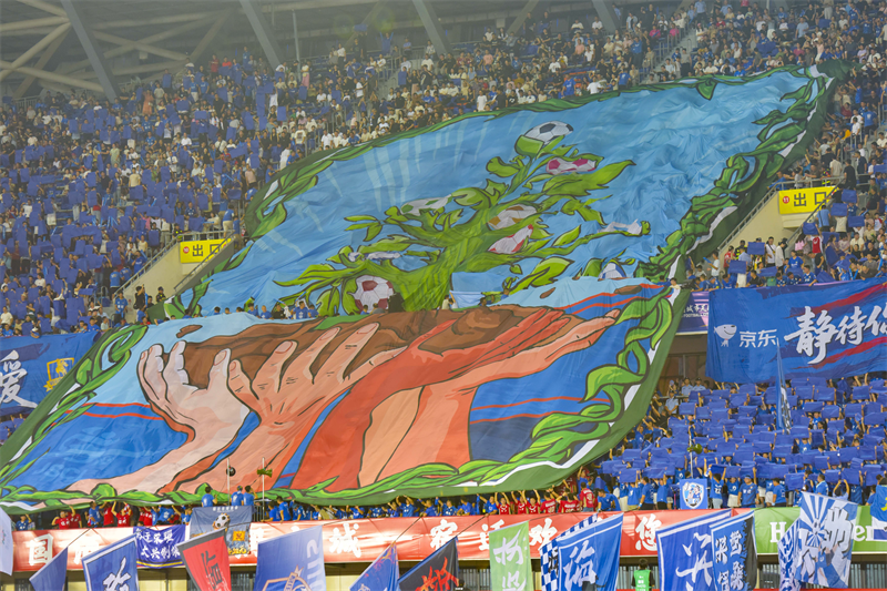 比赛开场前,宿迁主场看台上展开一幅以联赛13支球队为元素绘制的参天巨树巨型TIFO。贺敬华 摄