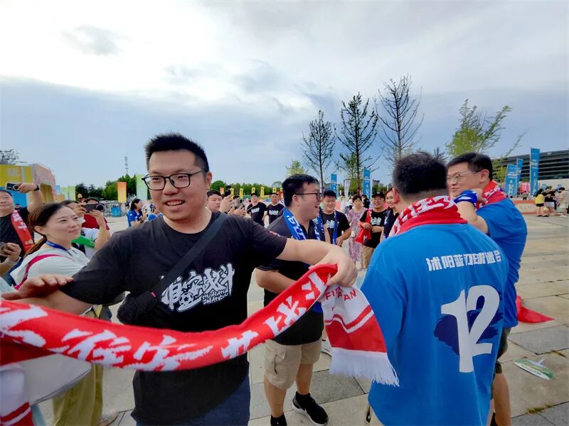 淮安与宿迁球迷互换纪念围巾。庄军 摄