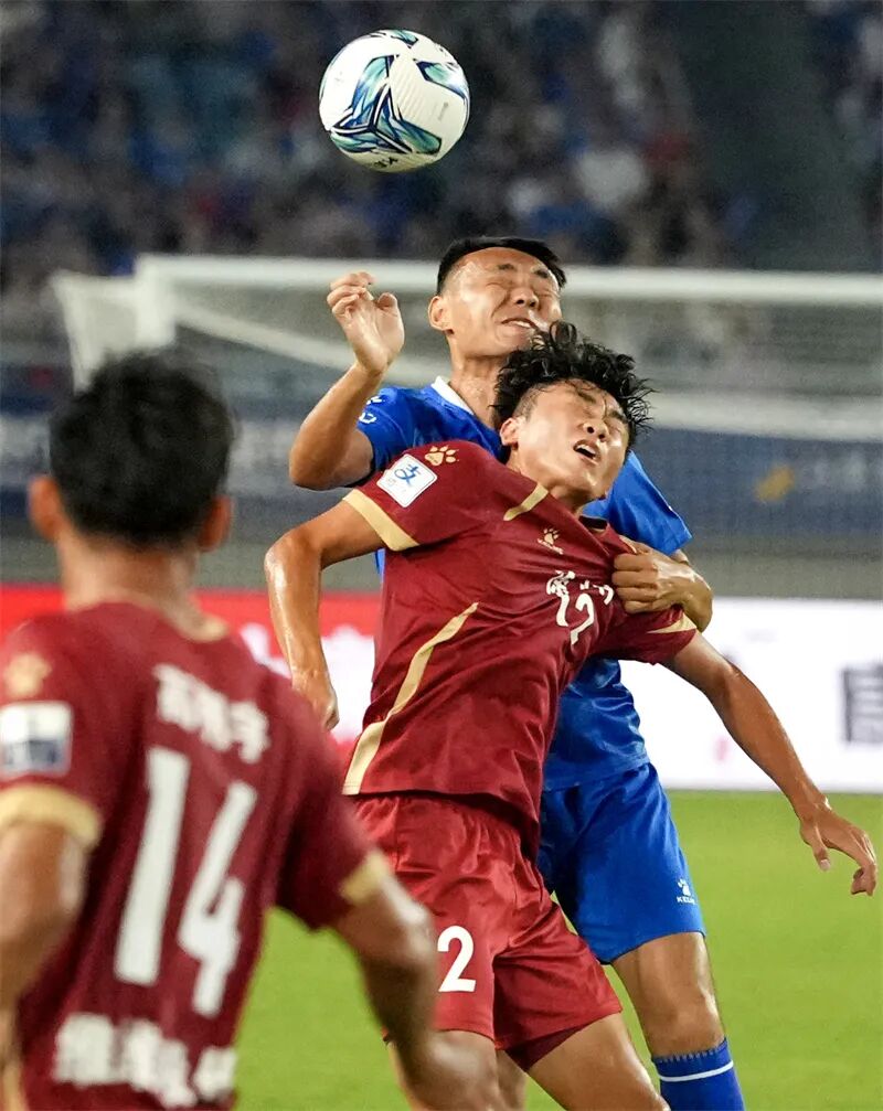 双方队员争顶头球。曹政 摄