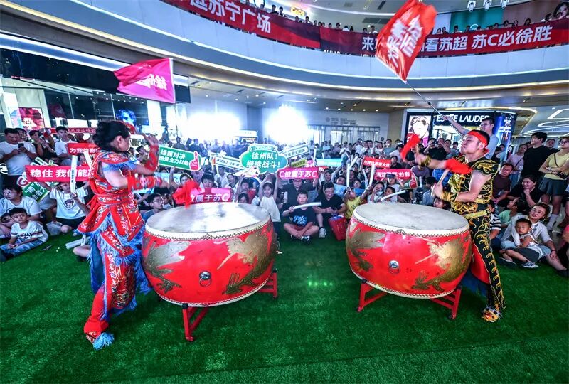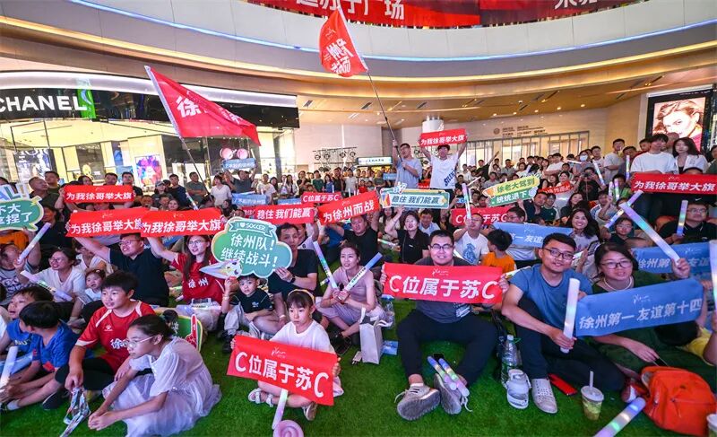 在徐州苏宁大厦直播现场,徐州球迷为家乡队助力。刘立明 摄