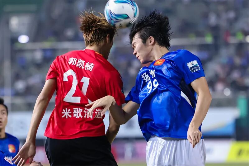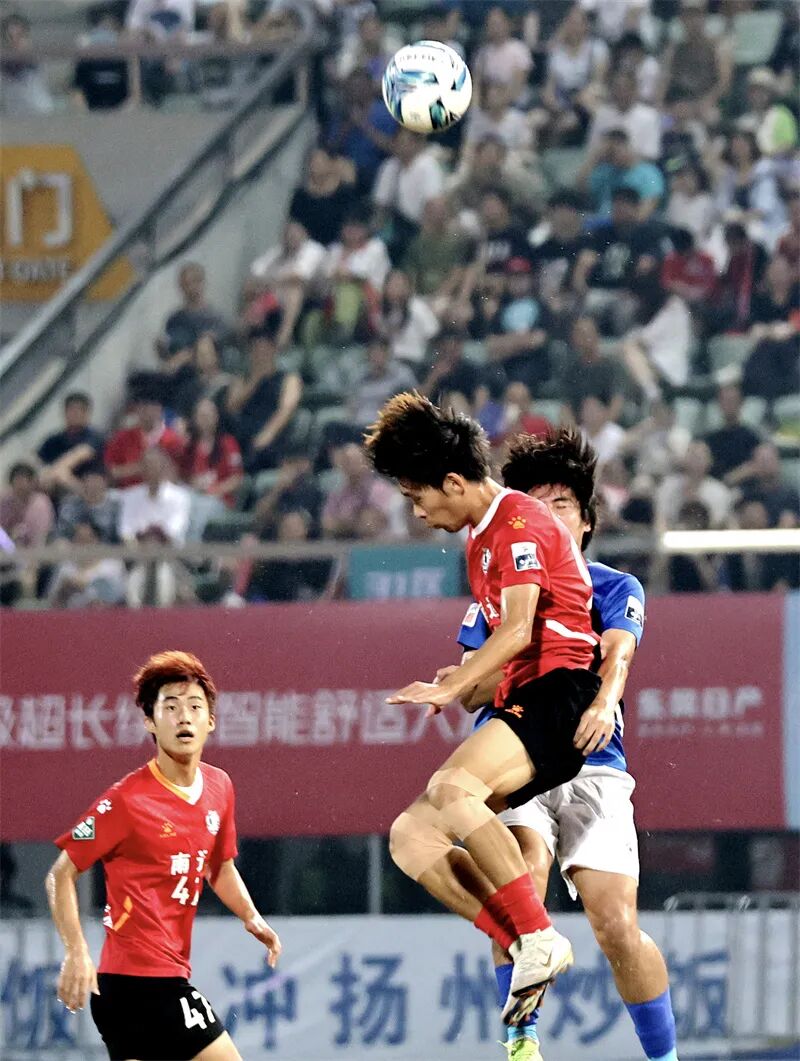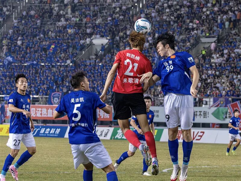 扬州队球员头球解围。刘江瑞 摄