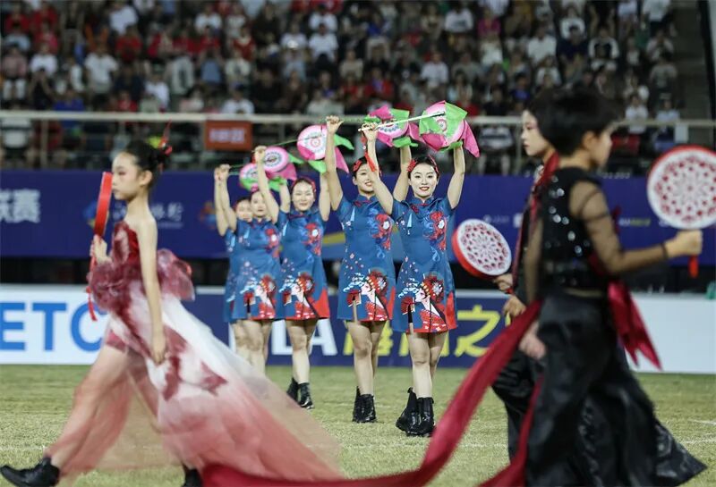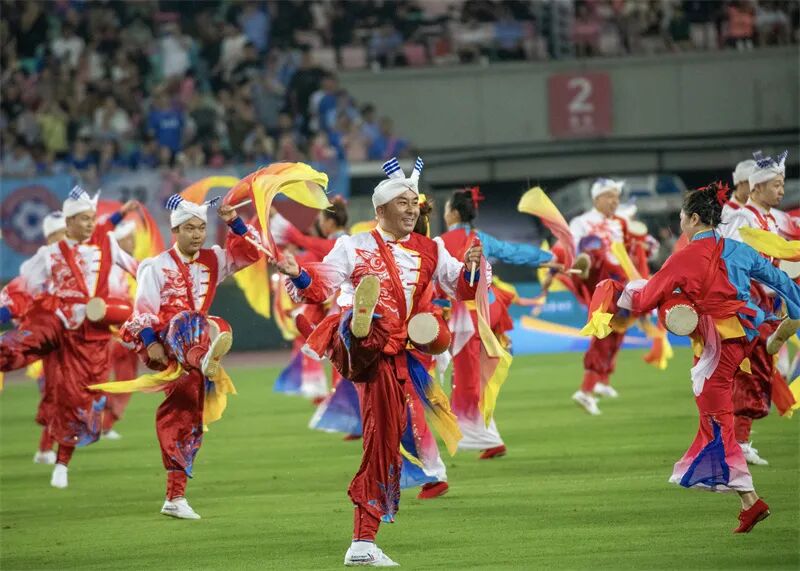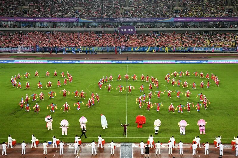 延安延文集团百人安塞腰鼓助威“苏超”无锡主场。吴俊 摄