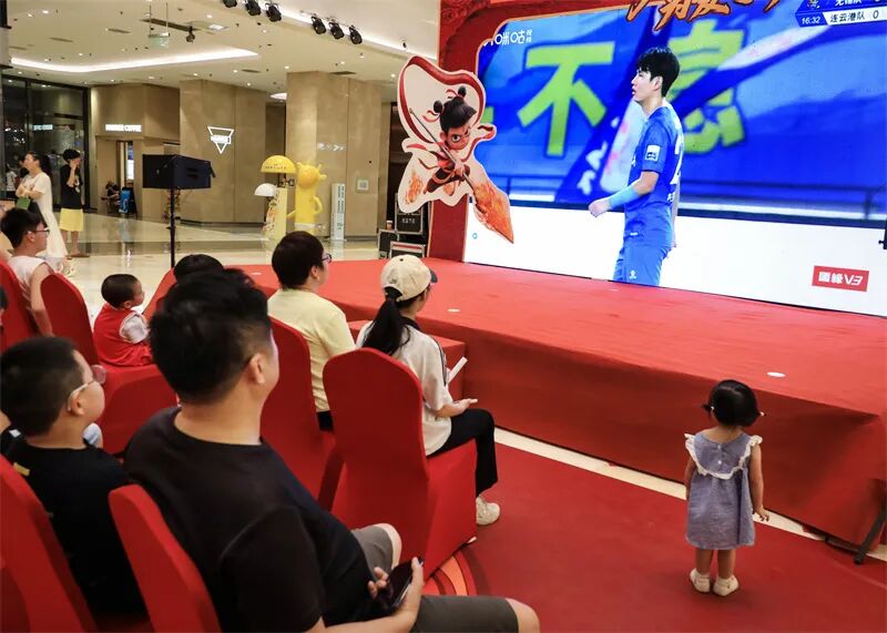 9月6日,宜兴球迷在八佰伴生活广场观看无锡队VS连云港队比赛直播。丁焕新 摄
