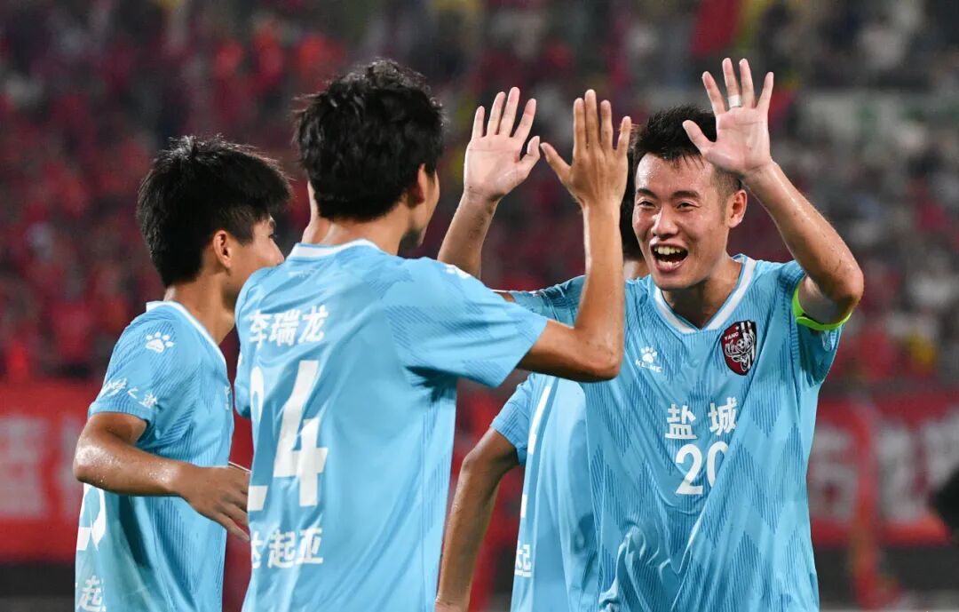 盐城队球员射门得分,相互击掌庆祝。史康 摄