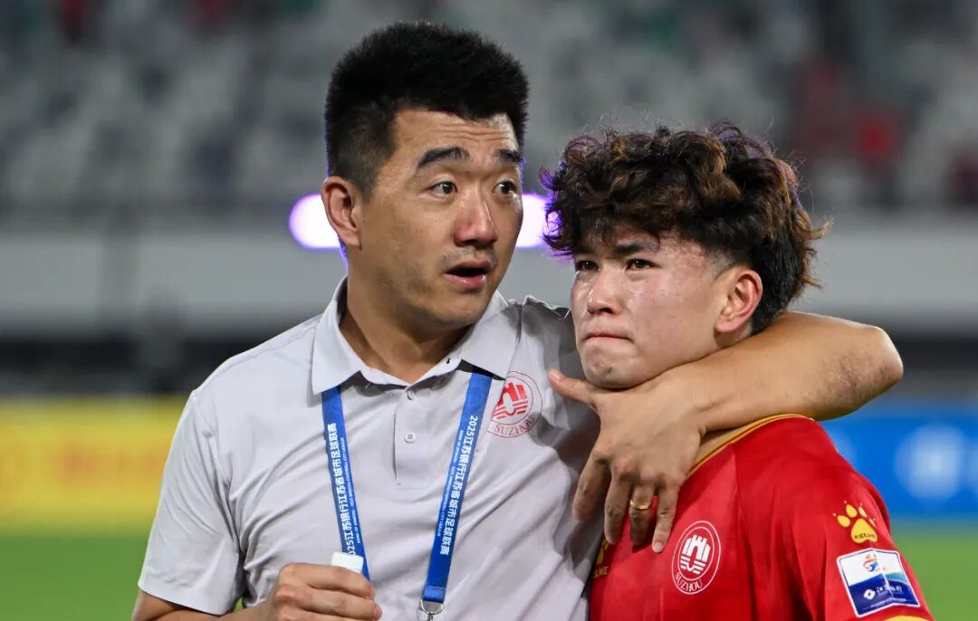 苏州队主教练郭旭在比赛后与球员寇程交流。王须中 摄