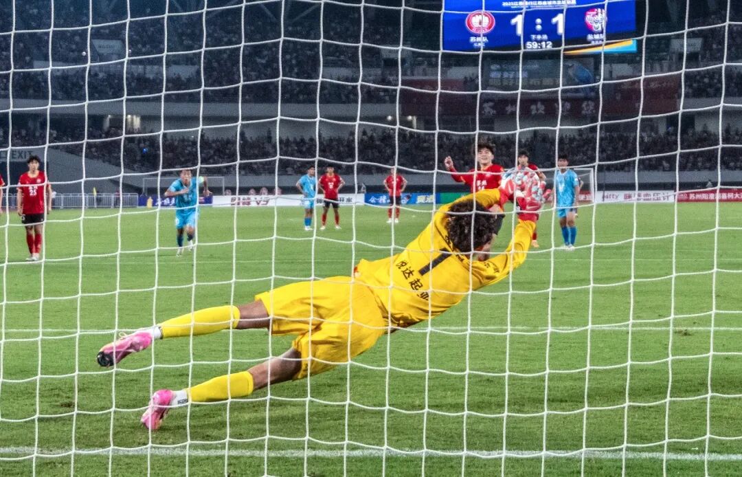 苏州队球员寇程主罚点球,被盐城队守门员扑出。吴雪 摄