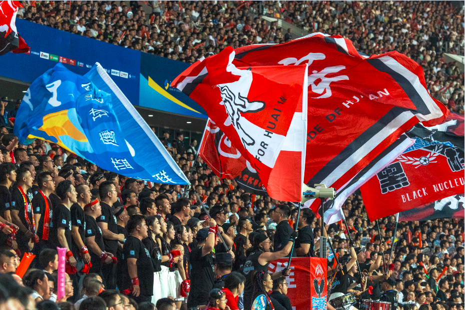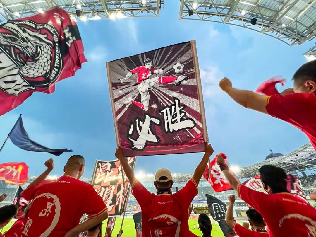 苏州的球迷举起“必胜”的战旗。纪昌盛 摄