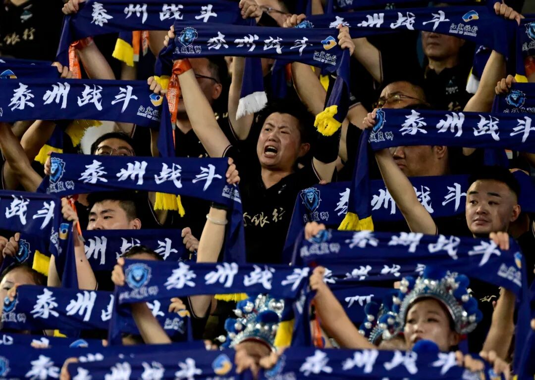 泰州队和淮安队球迷分别为各自球队加油呐喊。曹政 摄