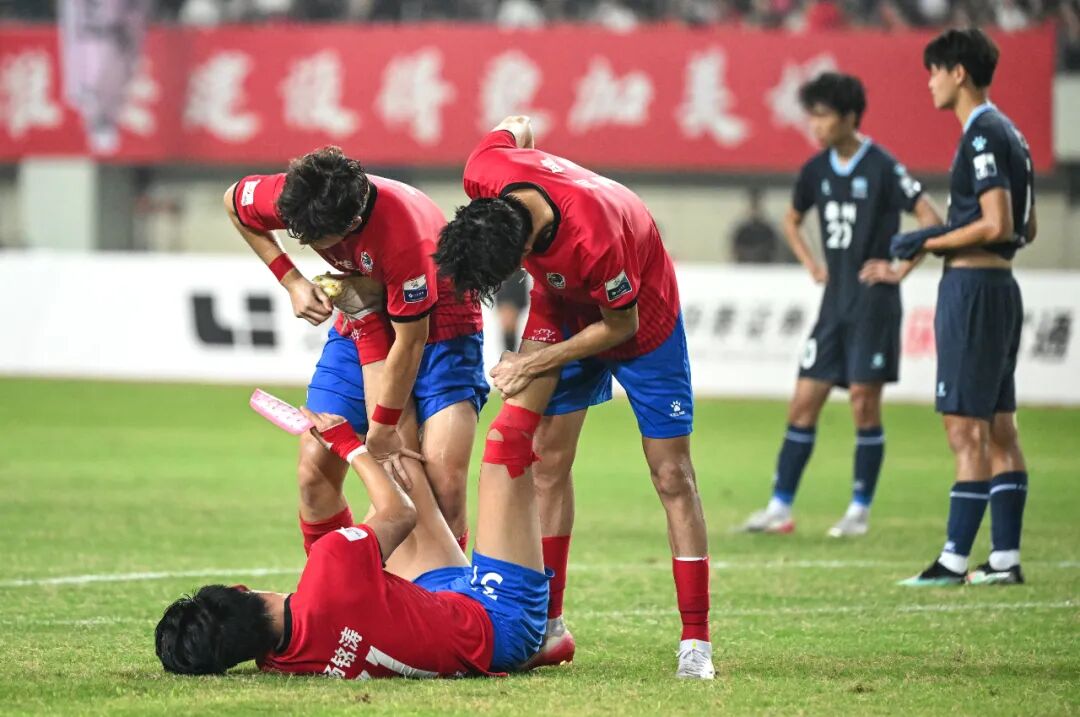 双方球员拼抢到力竭抽筋,在队友的帮助下缓解疼痛。万程鹏 摄