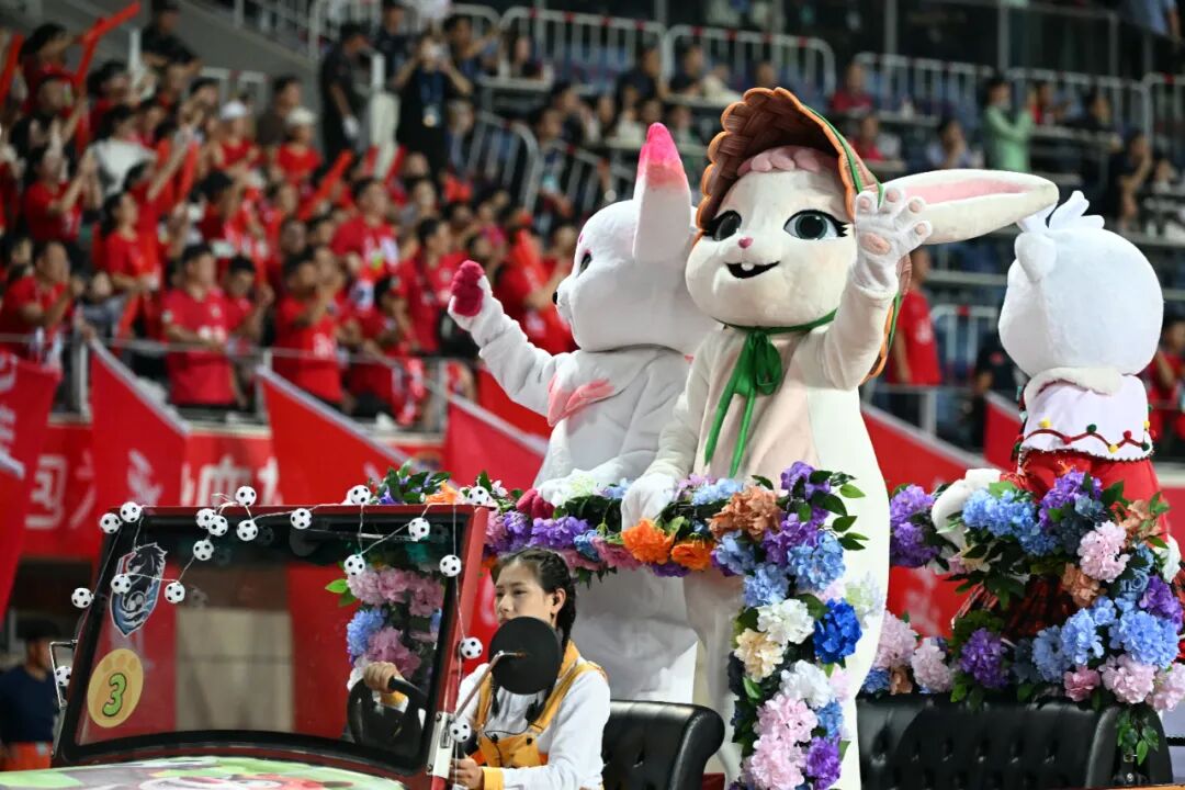 9月7日晚,“苏超”第十一轮,苏州队在苏州市体育中心体育场迎战盐城队。最终盐城队以3:2击败苏州队,积19分锁定前八。上图为开赛前的升旗仪式。余萍 摄