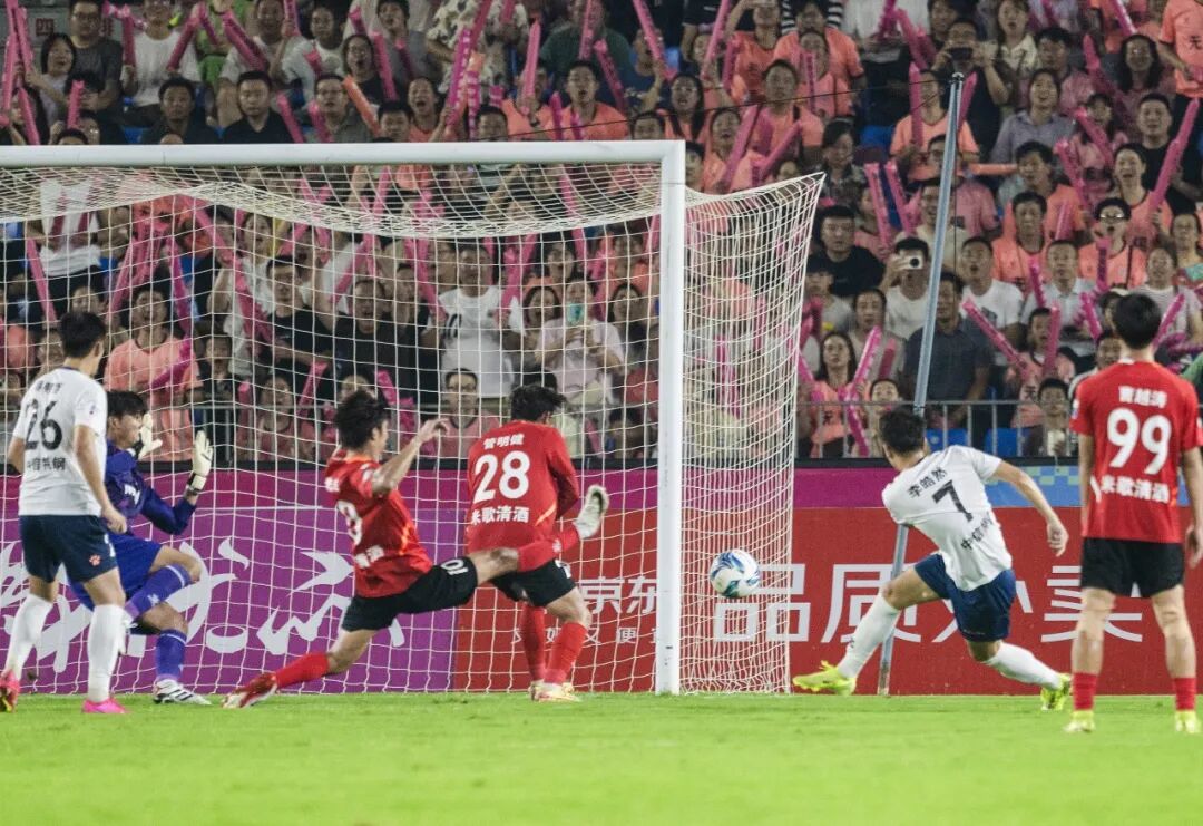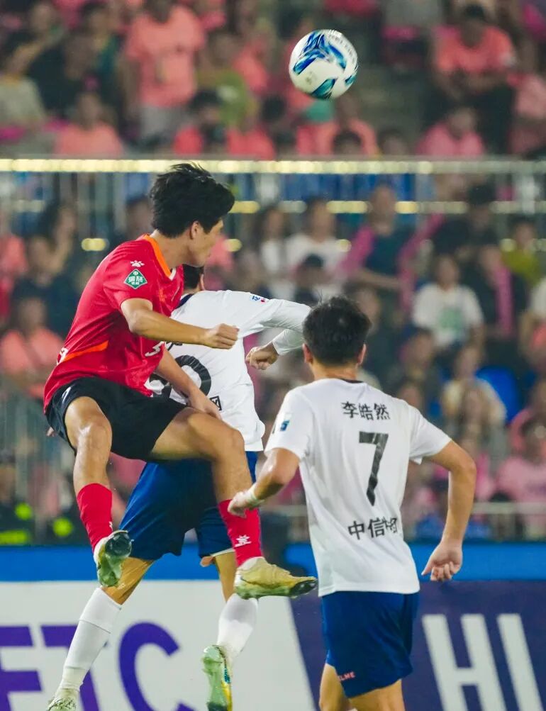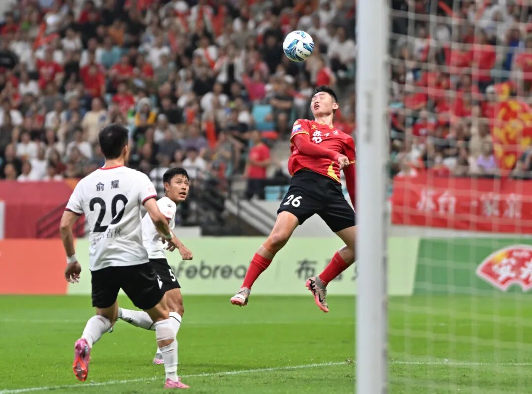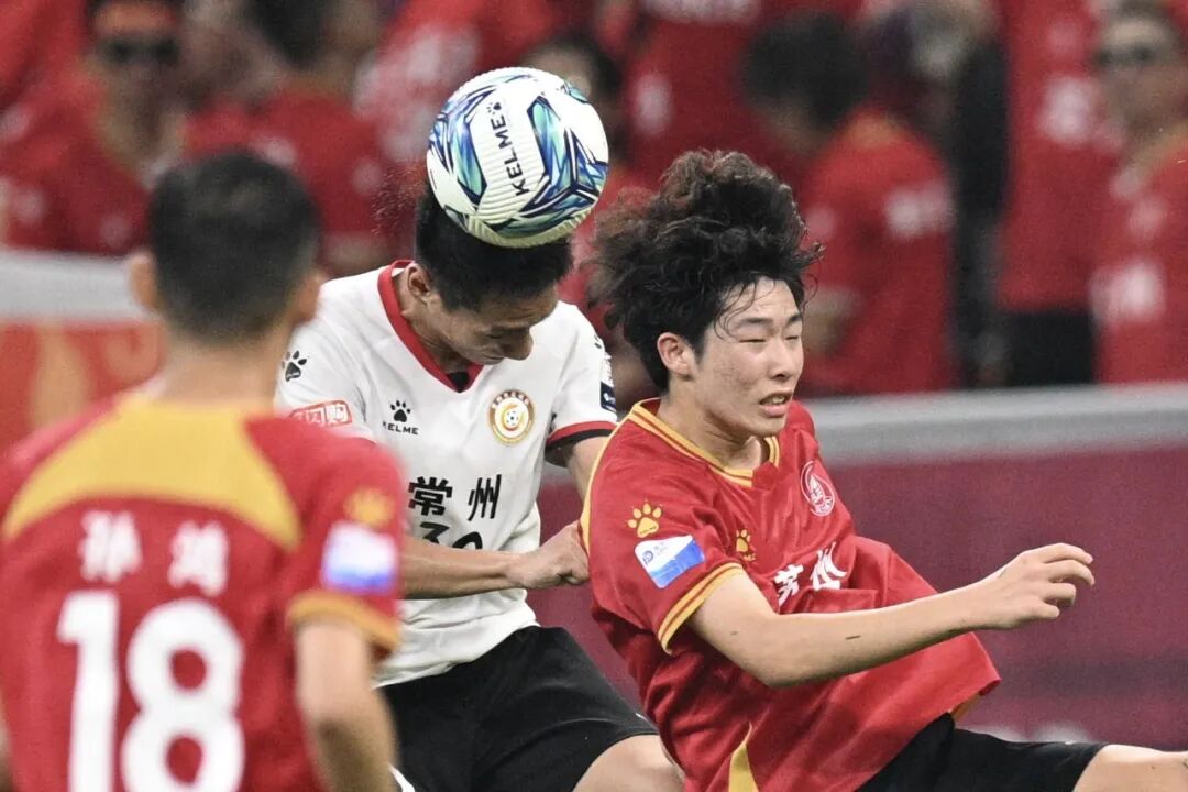 伤停补时阶段,苏州队26号球员边禹豪攻入一球,绝杀对手,最终苏州队3:2胜常州队。袁新宇 摄