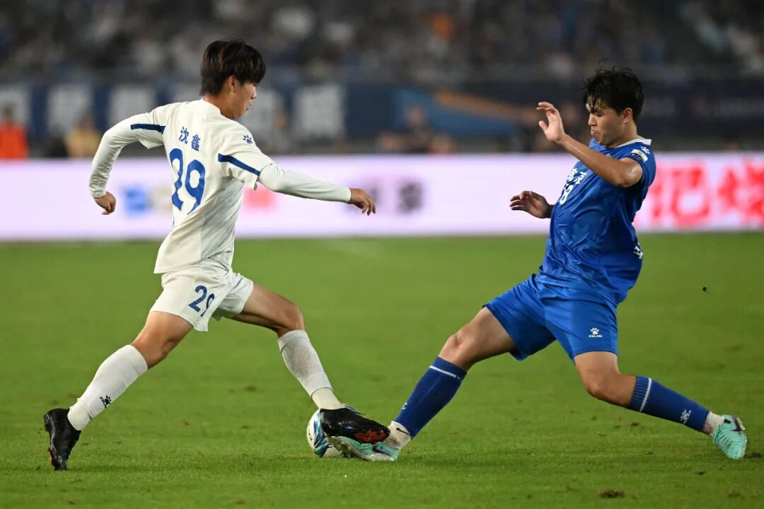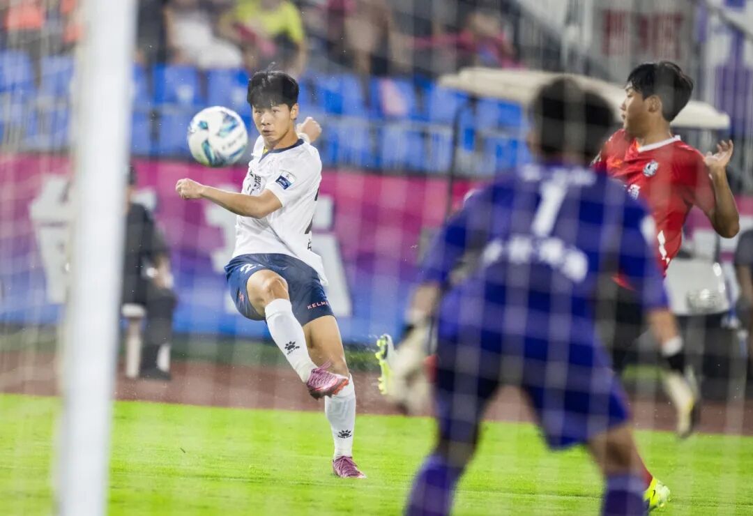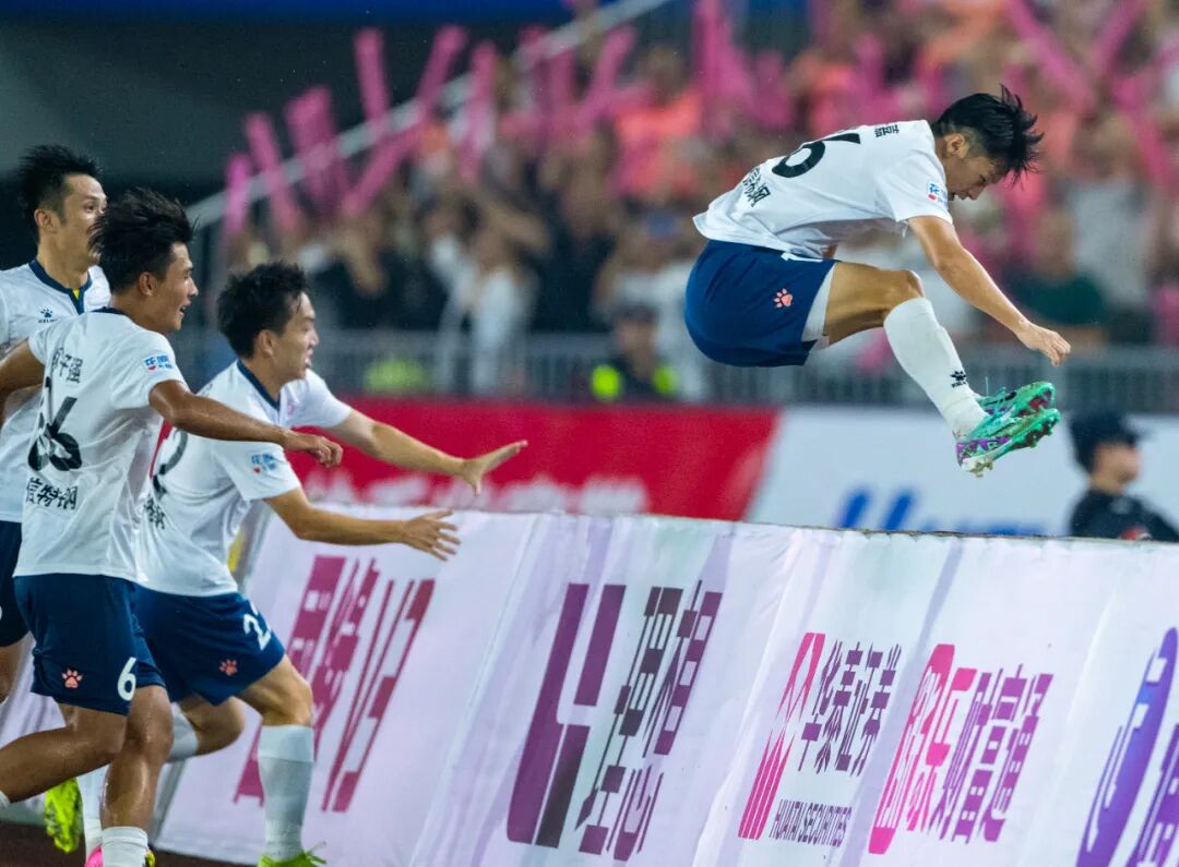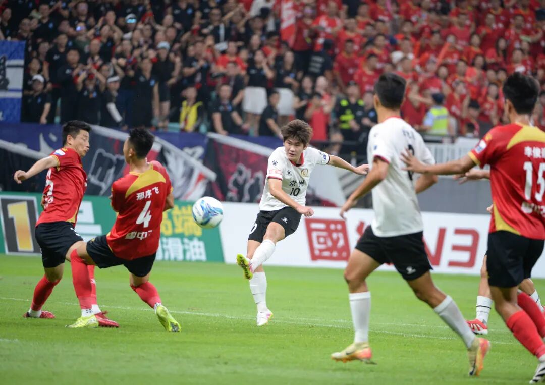 伤停补时阶段,苏州队26号球员边禹豪攻入一球,绝杀对手,最终苏州队3:2胜常州队。袁新宇 摄