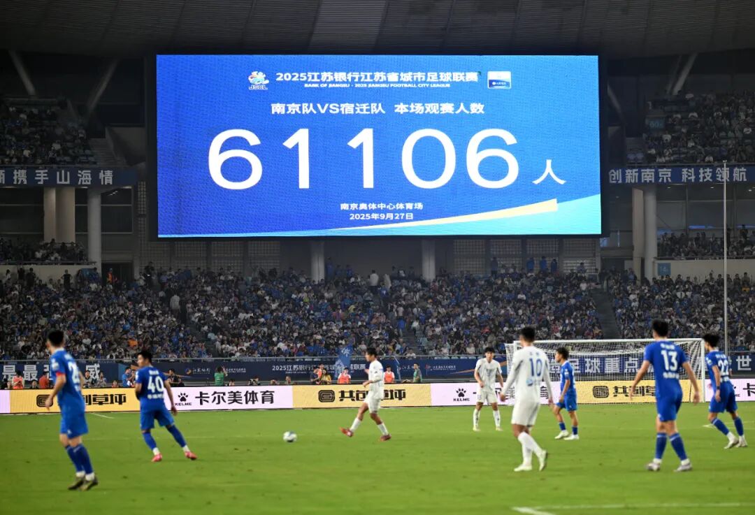 当晚,南京奥体中心体育场涌入61106人现场观赛,再次刷新了“苏超”单场比赛上座率纪录。万程鹏 摄