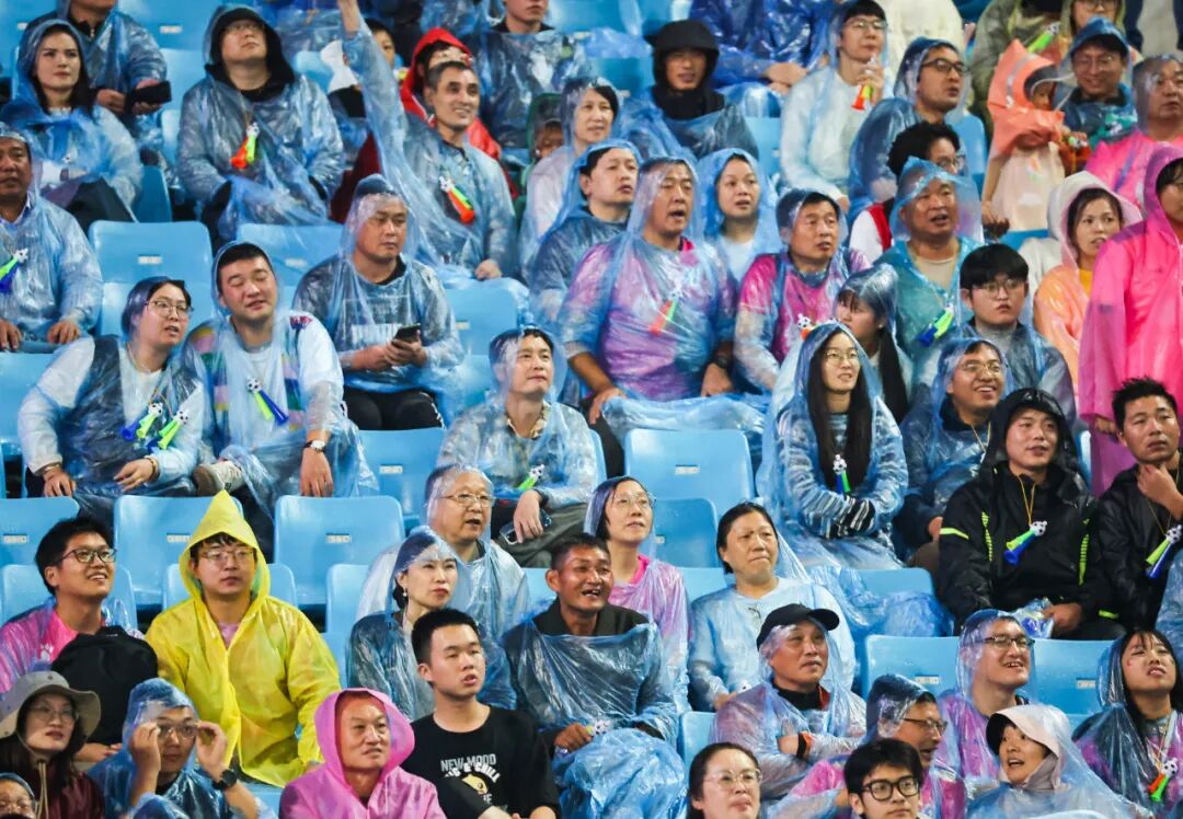 球迷在雨中为球员呐喊助威。蒋文超 摄