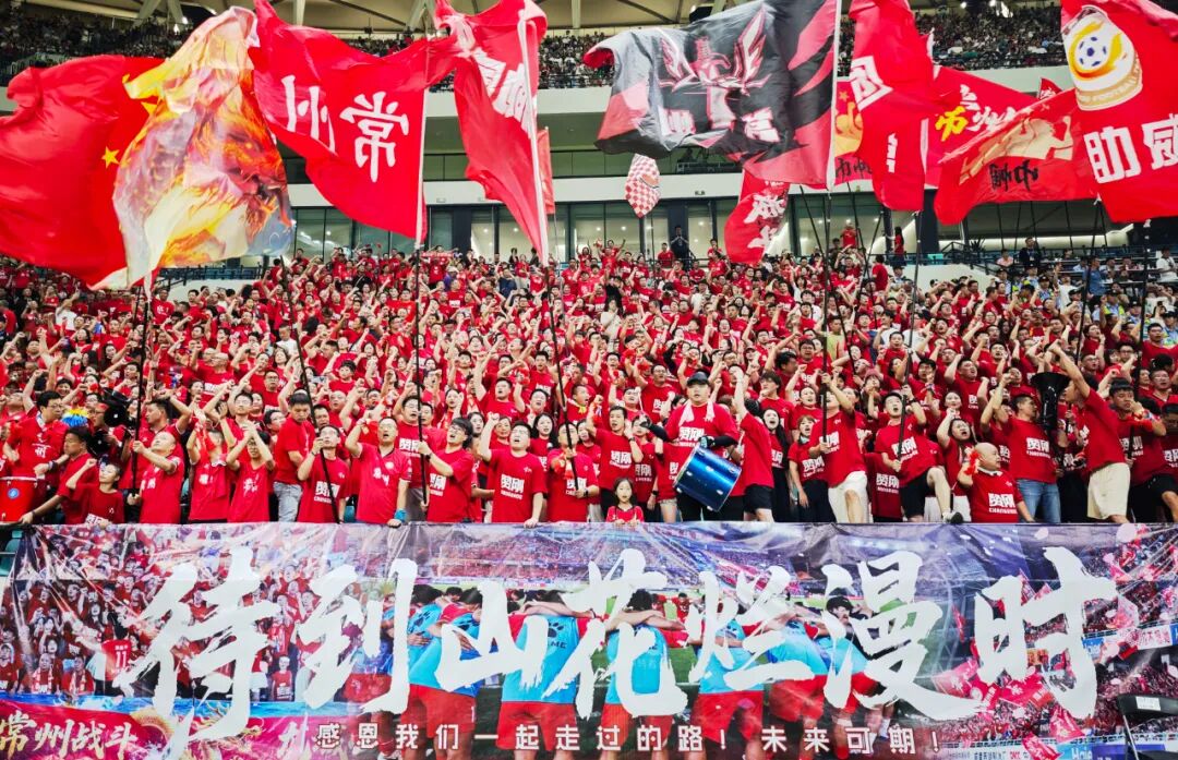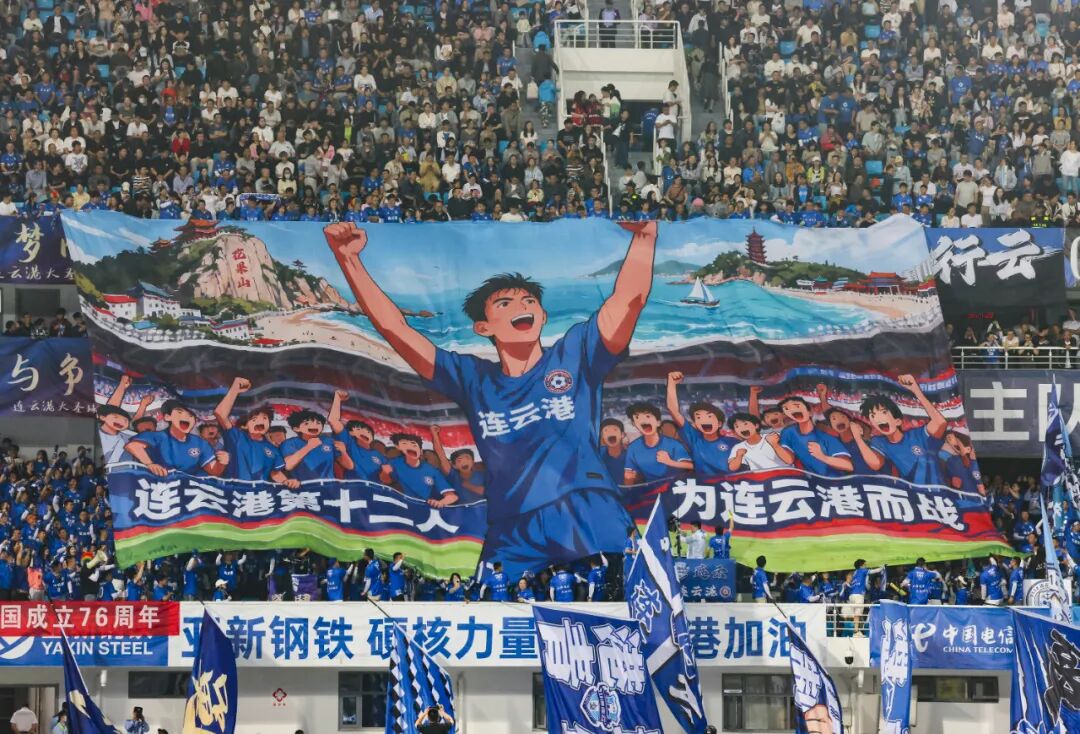 球迷横幅如海,助球队力克镇江。俞惠康 摄