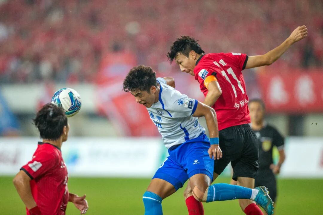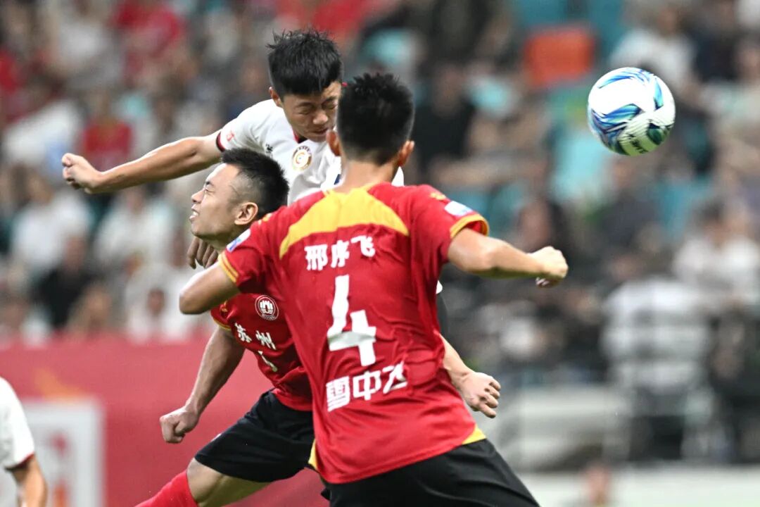 无锡队球员与南通队球员争顶头球。曹俊 摄