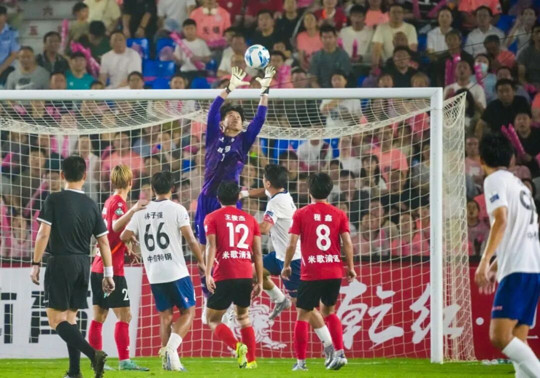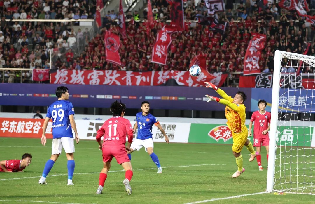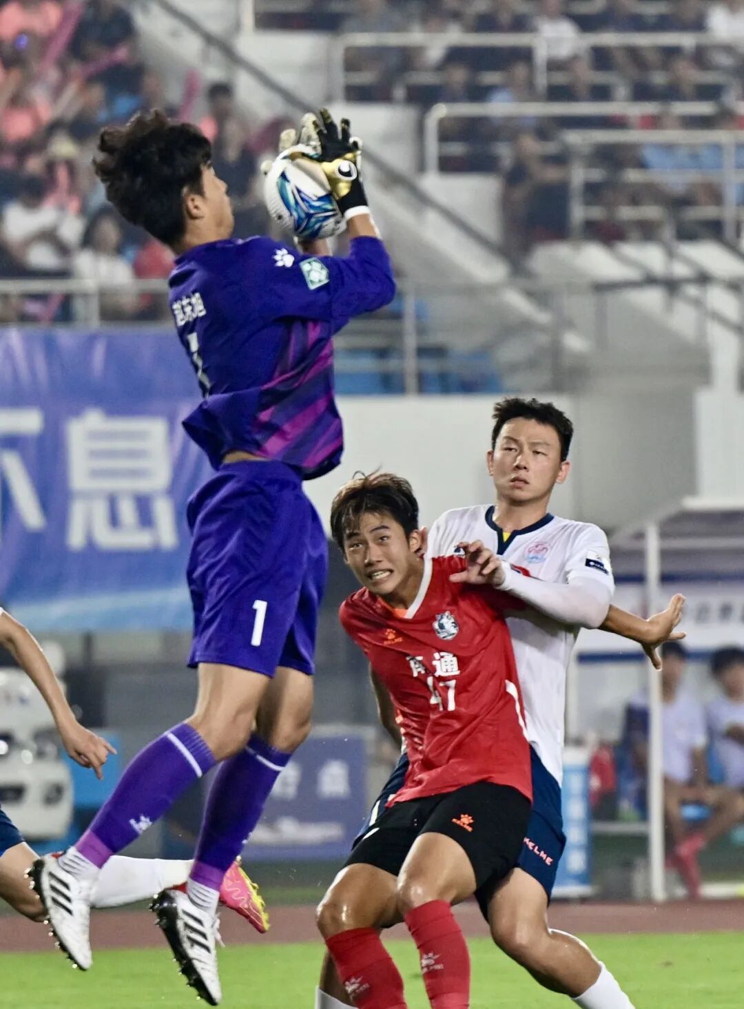 南通队守门员奋力扑救,成功化解危机。曹俊 摄