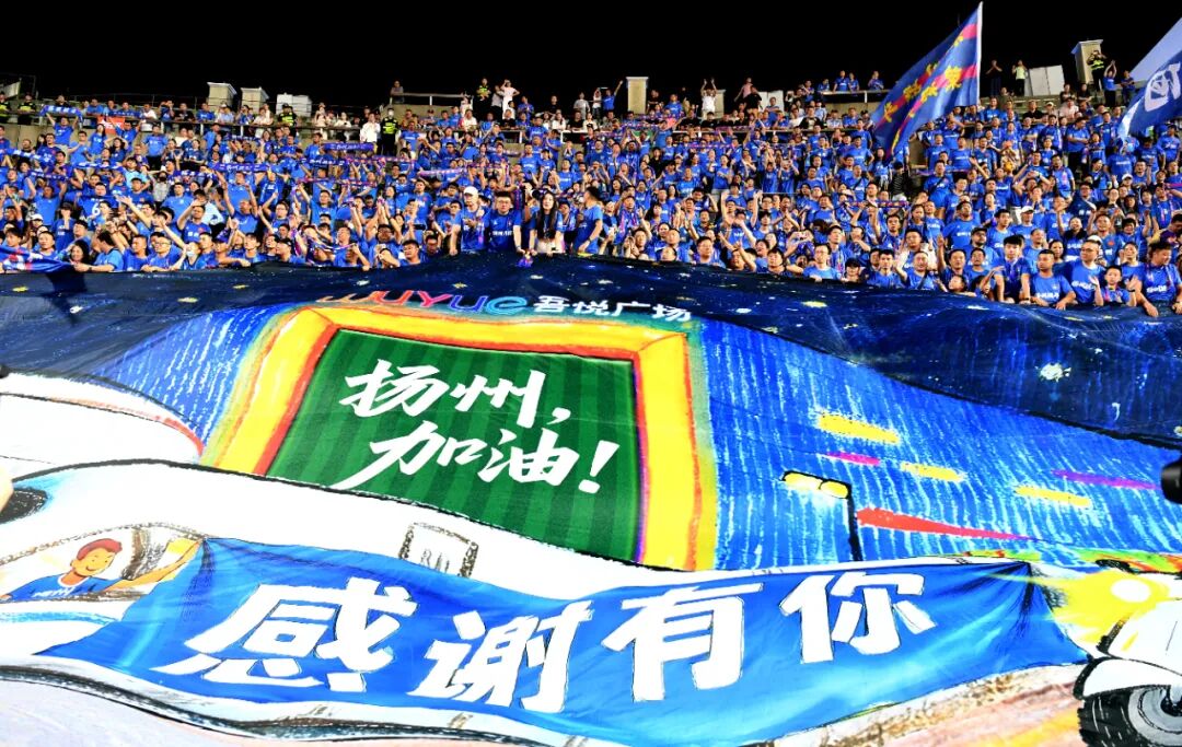 比赛后,扬州队球迷打出“扬州加油 感谢有你”的标语,鼓励球员。郎从柳 摄