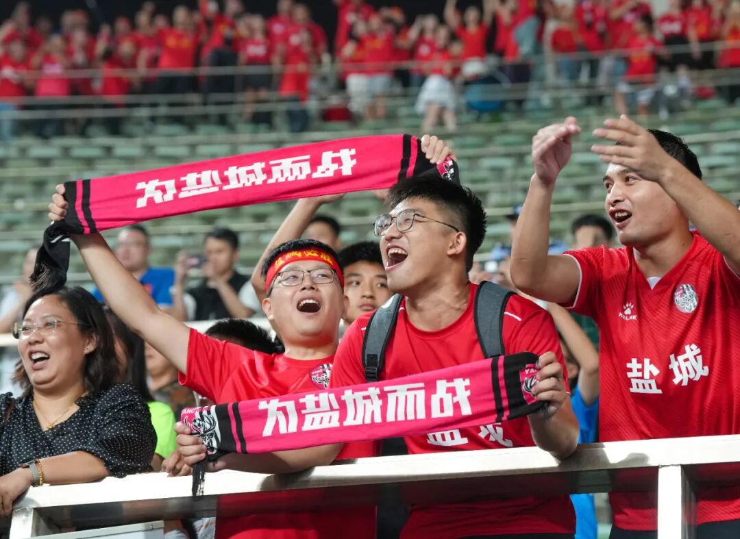获胜后,盐城球迷欣喜若狂。周晨阳 摄