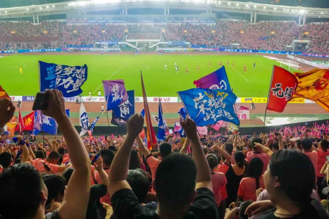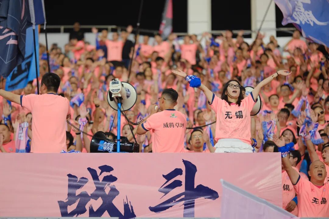 无锡队进球后,无锡球迷群热烈庆祝。曹俊 摄