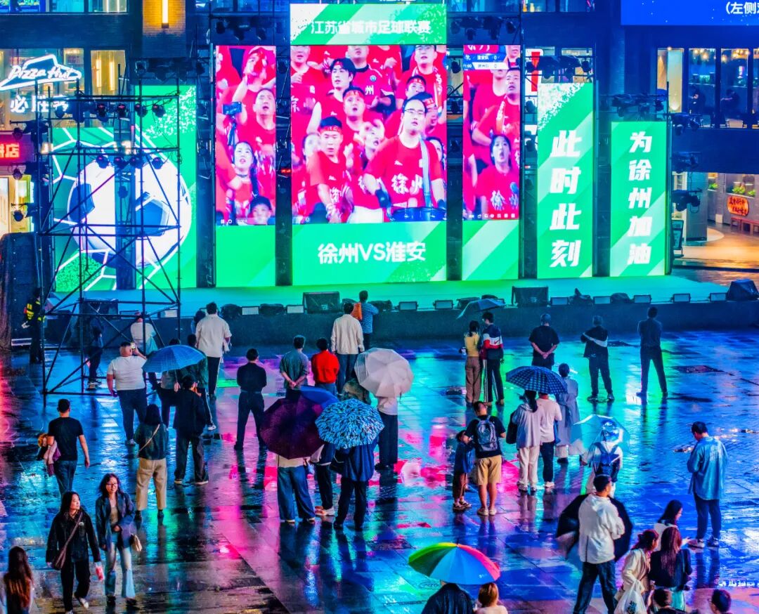 细雨蒙蒙,也挡不住徐州球迷在直播现场观看淮安队与徐州队比赛的热情。徐州市文庙直播现场,徐州球迷冒雨观看球赛。刘立明 摄