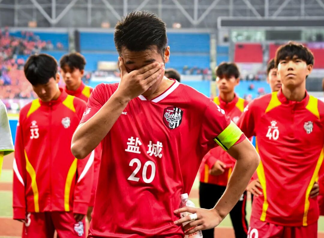 比赛后一名盐城队球员掩面而泣。郎从柳 摄