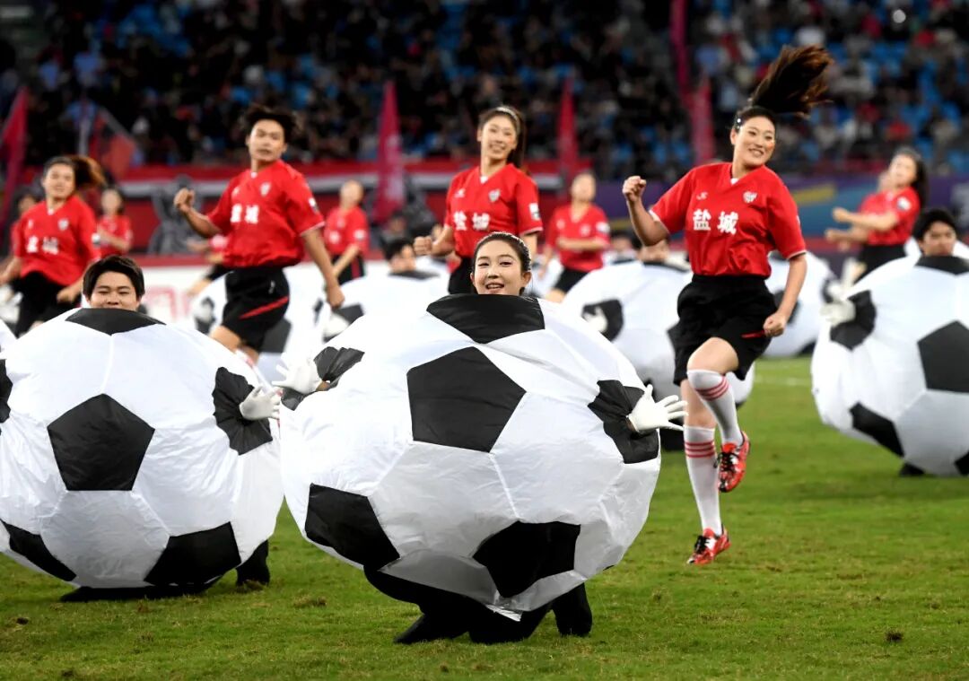 中场表演团体操《我们是“鹿”战队》足球气模方阵。郎从柳 摄