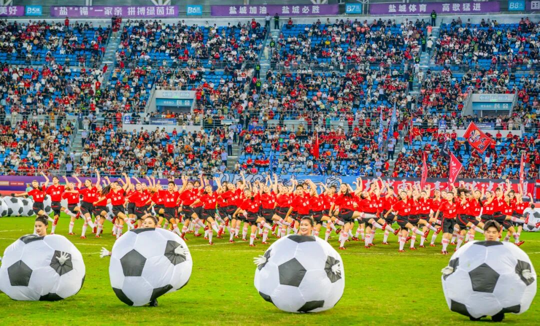 10月8日晚,“苏超”淘汰赛盐城队VS无锡队比赛,在盐城奥体中心体育场开赛。吴俊 摄