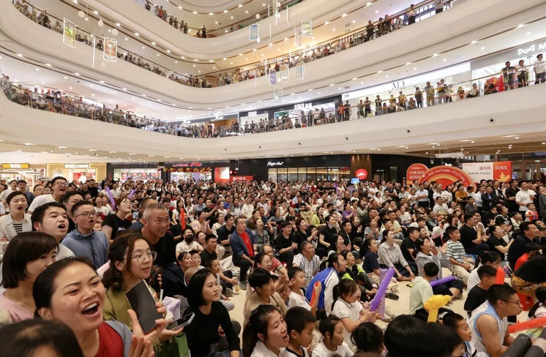 盐城悦达889商场内第二现场,球迷们为队员欢呼助力。崔桂林 摄