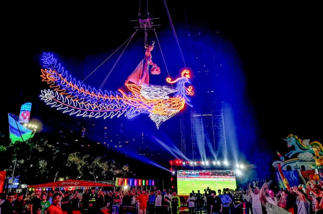 无锡太湖广场“苏超”第二现场,演员乘坐孔雀造型灯彩在空中表演天女散花,祝贺无锡队挺进半决赛。毛伟骏 摄