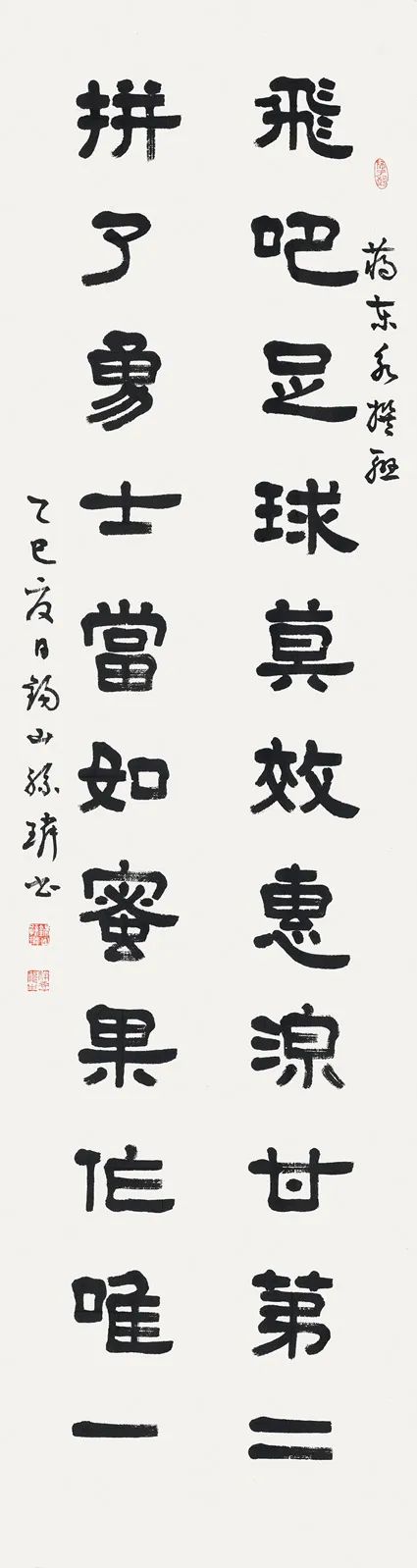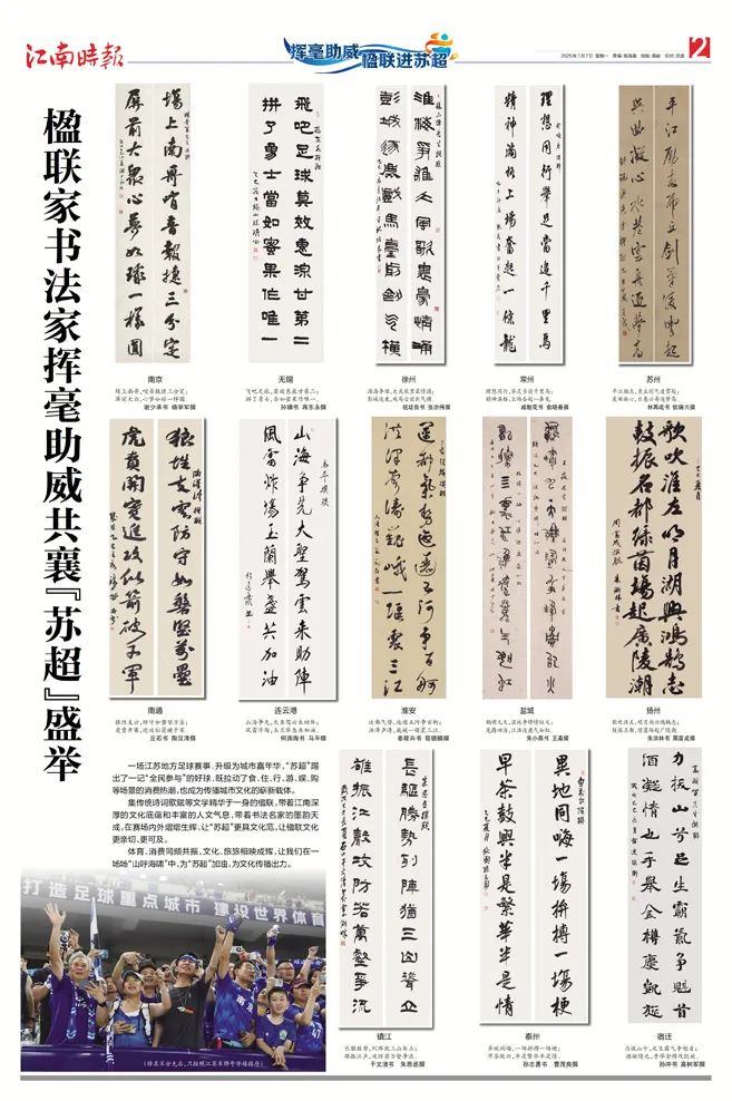 集传统诗词歌赋等文学精华于一身的楹联,带着江南深厚的文化底蕴和丰富的人文气息,带着书法名家的墨韵天成,在赛场内外熠熠生辉,让“苏超”更具文化范,让楹联文化更亲切、更可及。
