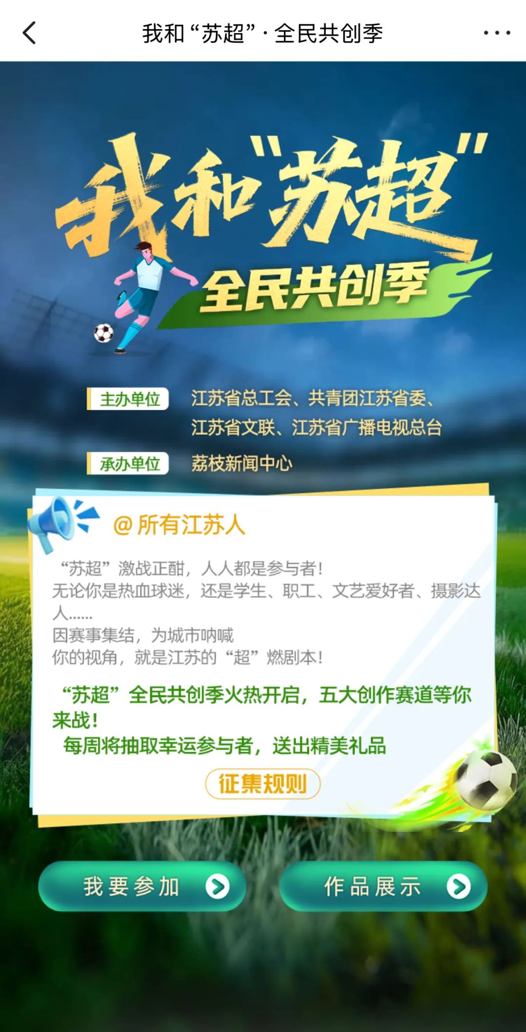 《我和“苏超”·全民共创季》由江苏省总工会、共青团江苏省委、江苏省文联、江苏省广播电视总台联合主办,荔枝新闻中心承办。无论你是激扬文字的“笔杆子”、妙手偶得的“摄影师”,还是擅长用镜头讲故事的“导演”,我们期待你用独特的视角捕捉“苏超”的心跳与烟火气。