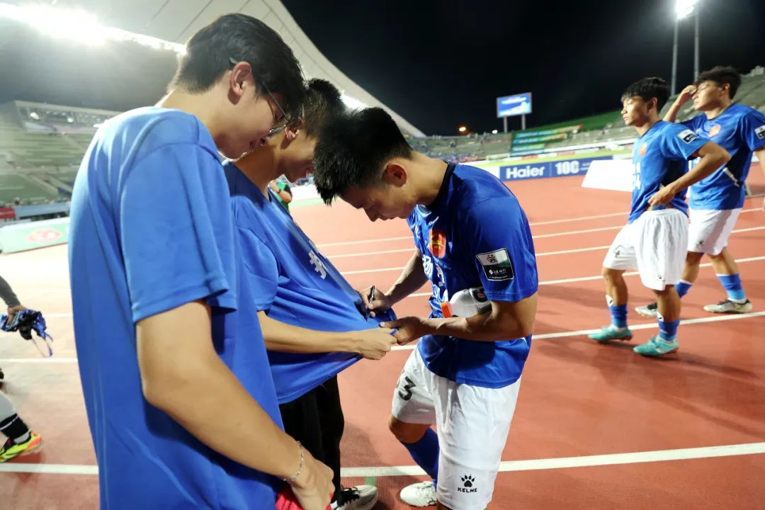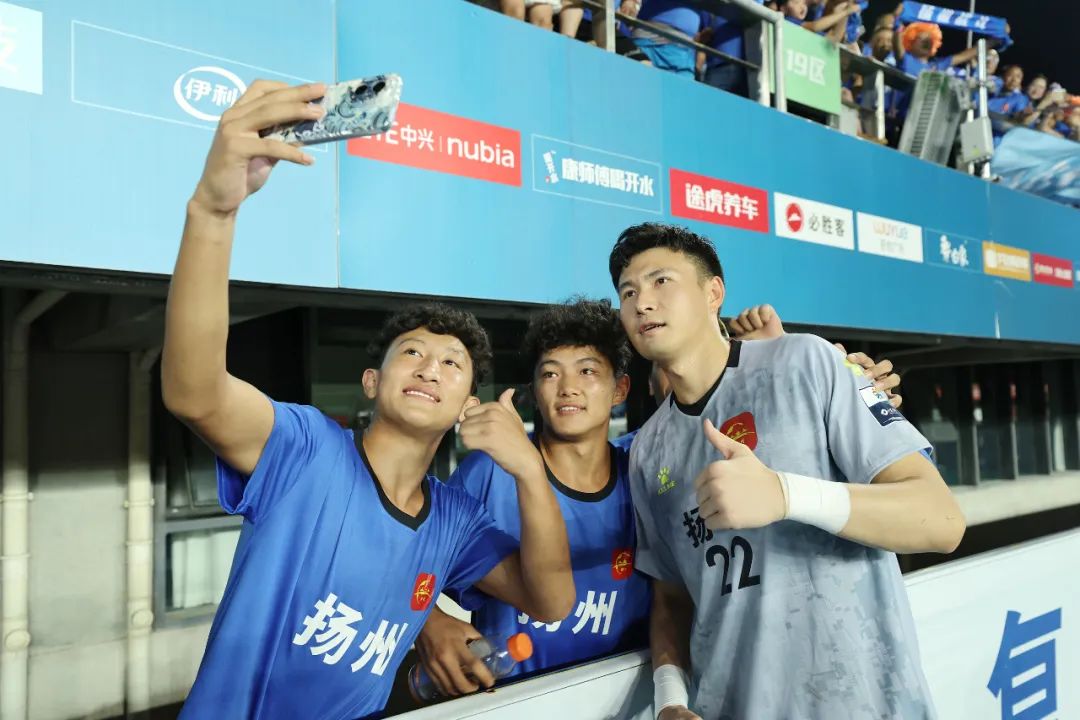 赛后扬州门将李新宇与球迷合影 赵红伟摄