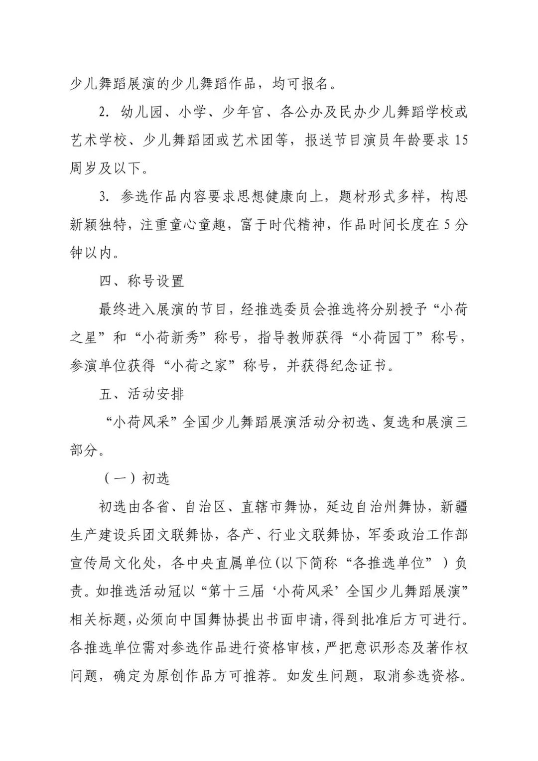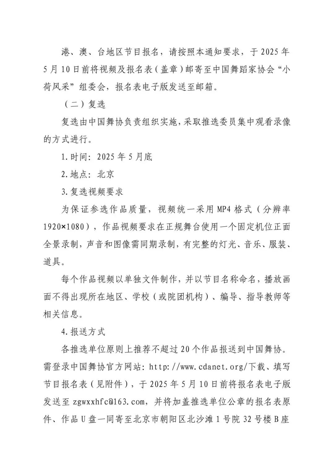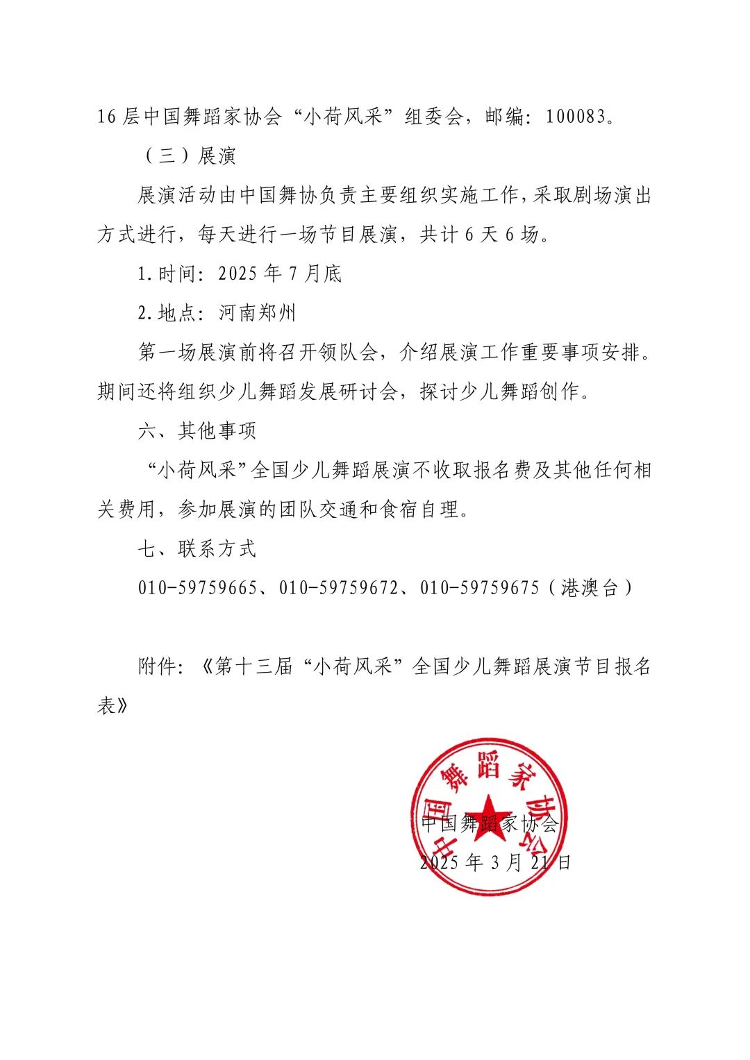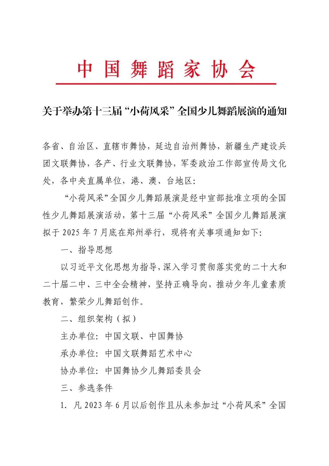 为积极响应中国舞蹈家协会有关工作部署,现将《关于举办第十三届“小荷风采”全国少儿舞蹈展演的通知》转发给你们。江苏省第十一届少儿舞蹈展演暨第十三届“小荷风采”全国少儿舞蹈展演江苏省选拔活动将于5月7日-9日举办,省级现场展演排名前20名的舞蹈作品,将推荐至中国舞协参加第十三届“小荷风采”全国少儿舞蹈展演初选。各推选单位请于2025年4月18日前将word版本报名表发送至991645016@qq.com,视频U盘和纸质盖章版报名表报送至省舞协。