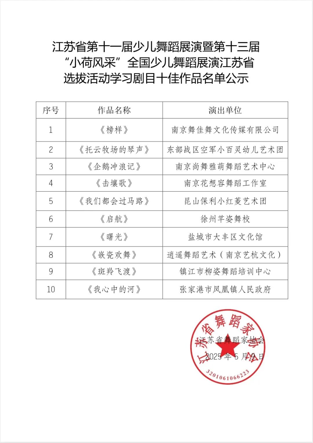 江苏省第十一届少儿舞蹈展演暨第十三届“小荷风采”全国少儿舞蹈展演江苏省选拔活动学习剧目十佳作品名单公示