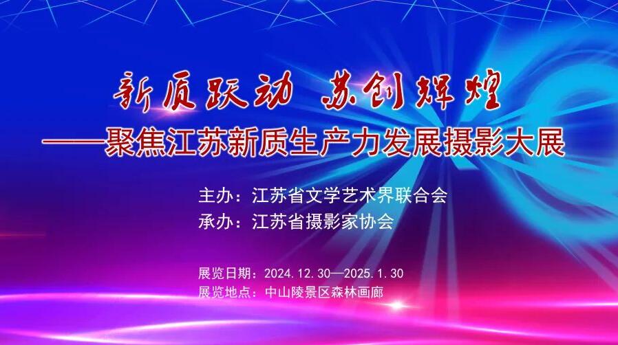 由江苏省文学艺术界联合会主办、江苏省摄影家协会承办的“新质跃动 苏创辉煌”——聚焦江苏新质生产力发展摄影大展,将于2024年12月30日14:30在南京市中山陵森林画廊举办开幕式,届时,热忱欢迎各位前来观展。
