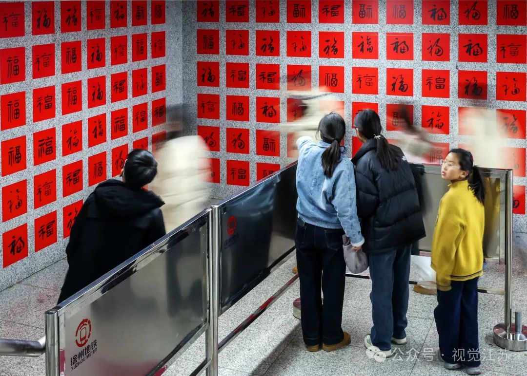 春节期间,徐州地铁1号线彭城广场站满墙的大红“福”字,让乘客非常暖心。高刚摄