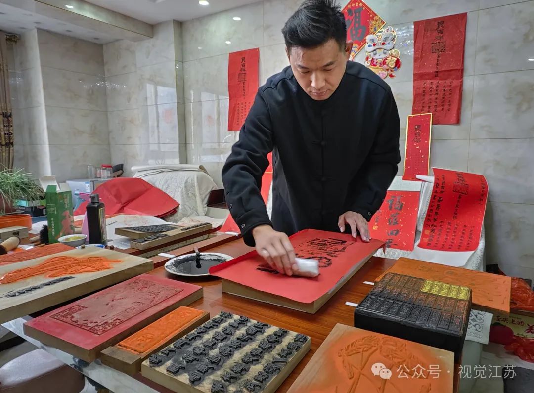 春节期间各类非遗文创产品很受欢迎。泰州小满非遗雕版印刷主理人封凯正在制作雕版印刷祈福卷轴挂件。杨进勇摄