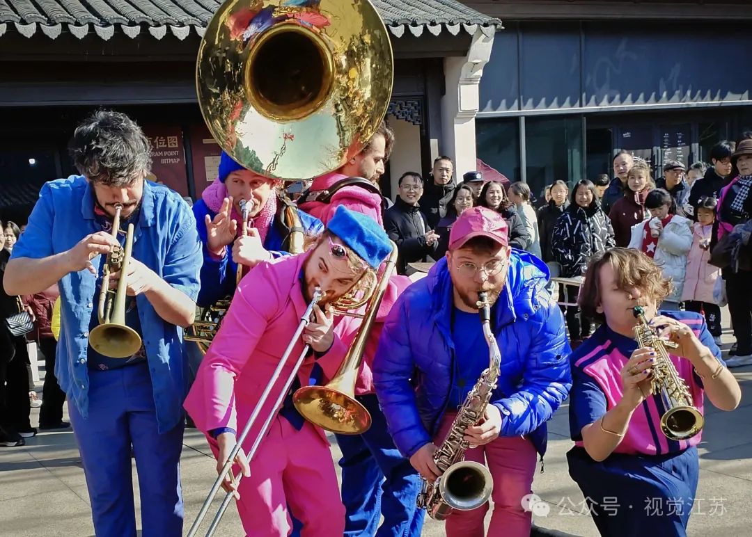 农历大年初一,2025“阳羡过大年”活动在宜兴雅达·阳羡溪山小镇红火开幕,来自国外的一支顽童乐队为众多游客送上新春欢乐和美好祝福。丁焕新摄