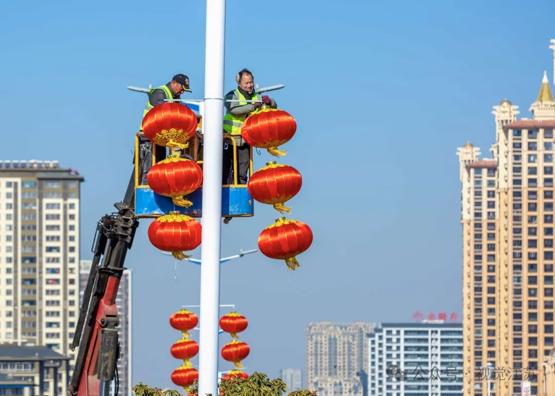 1月16日,新年将至,宿迁市沭阳县北京路街道两侧,工人正在悬挂红灯笼,营造节日喜庆气氛。罗红摄